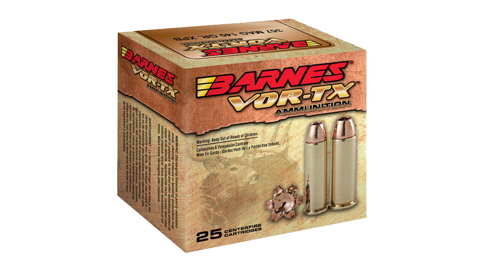This cartridge has a muzzle velocity of 1260 feet per second, with a muzzle energy of 626 foot pounds of force. This cartridge will shoot straight through soft tissue and bone with ease. The Barnes Vor-Tx bullets are built to withstand the powerful recoil of these magnum handguns and remain intact during penetration.